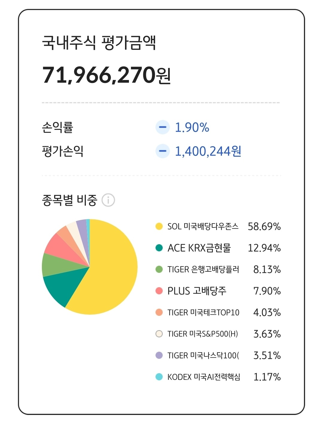 | [2025년 7월 투자결산] 고배당주·금현물·AI 인프라 ETF 수익 공개! 누적 수익 1,100만 원 돌파 (7) | 2025.07.30 |