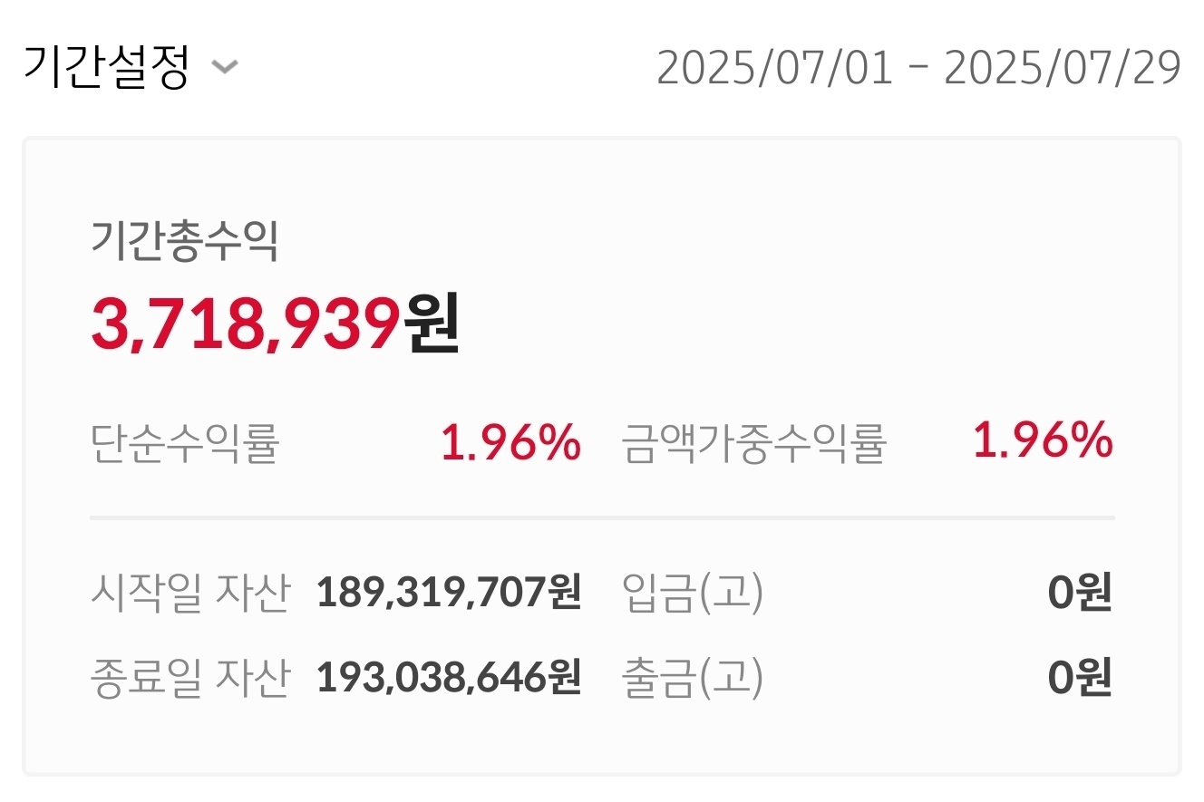- 단순 수익률과 금액 가중 수익률 모두 7월 한 달간 1.96% 기록